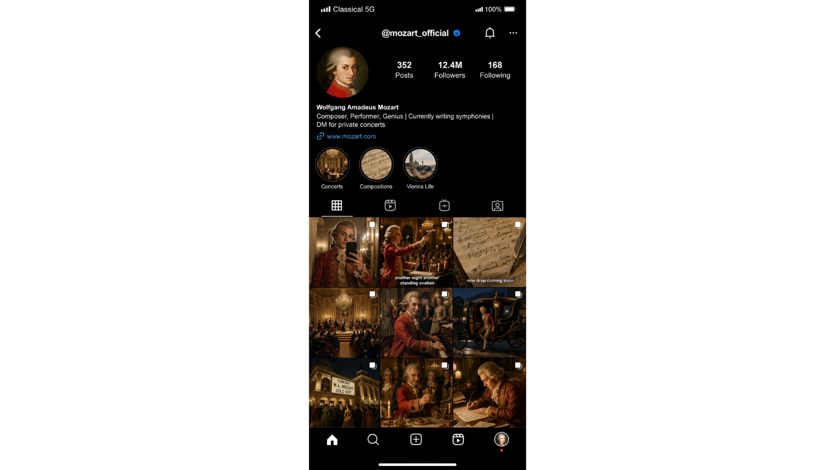 - Instagram UI elements β grid spacing, profile layout, story circles, navigation bar β feel like real iOS screenshots, not stylized imitations.