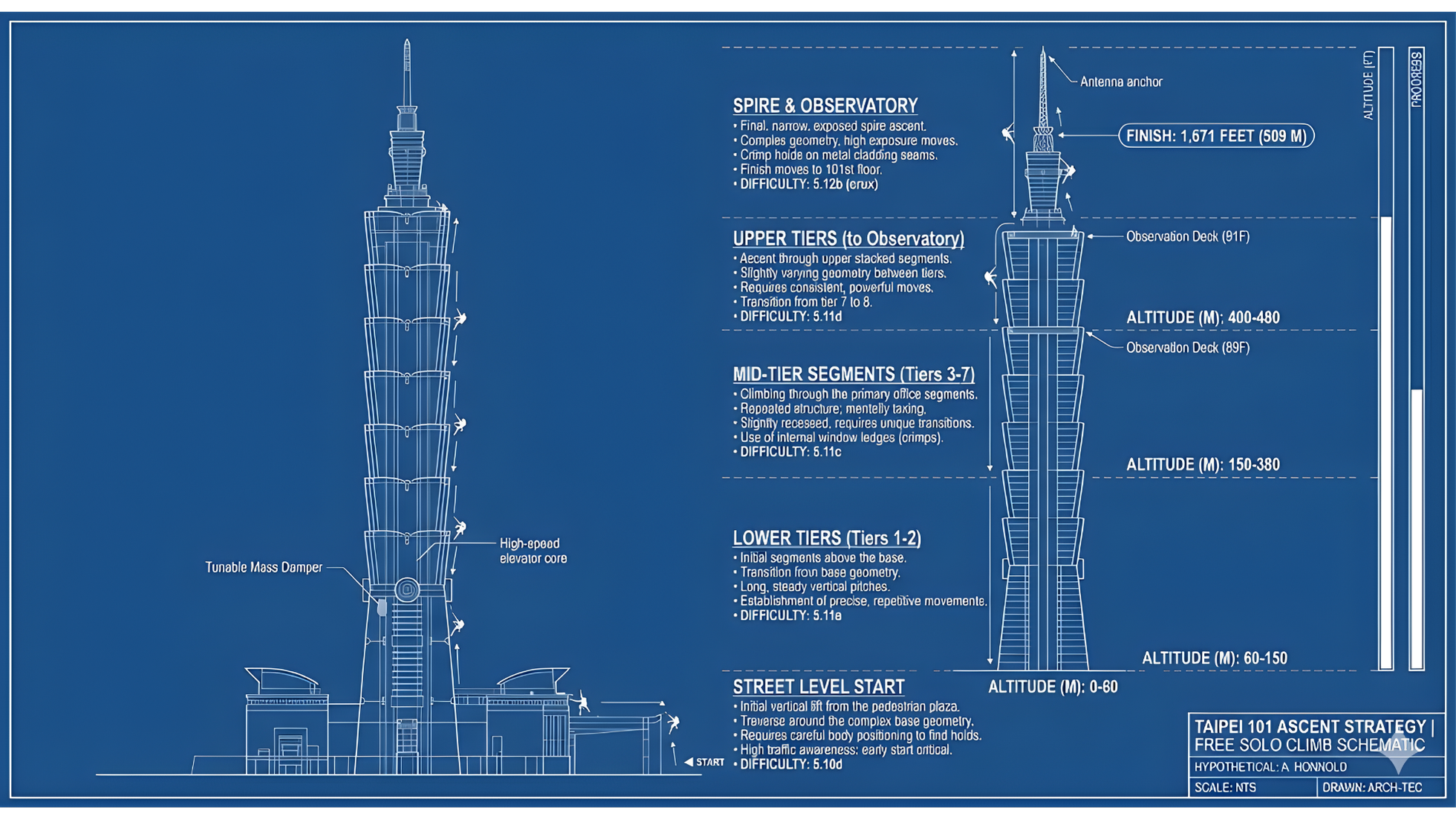 In this example, the prompt combines an architectural base with a storytelling dimension, turning a skyscraper into a visual map of Alex Honnold's climb.