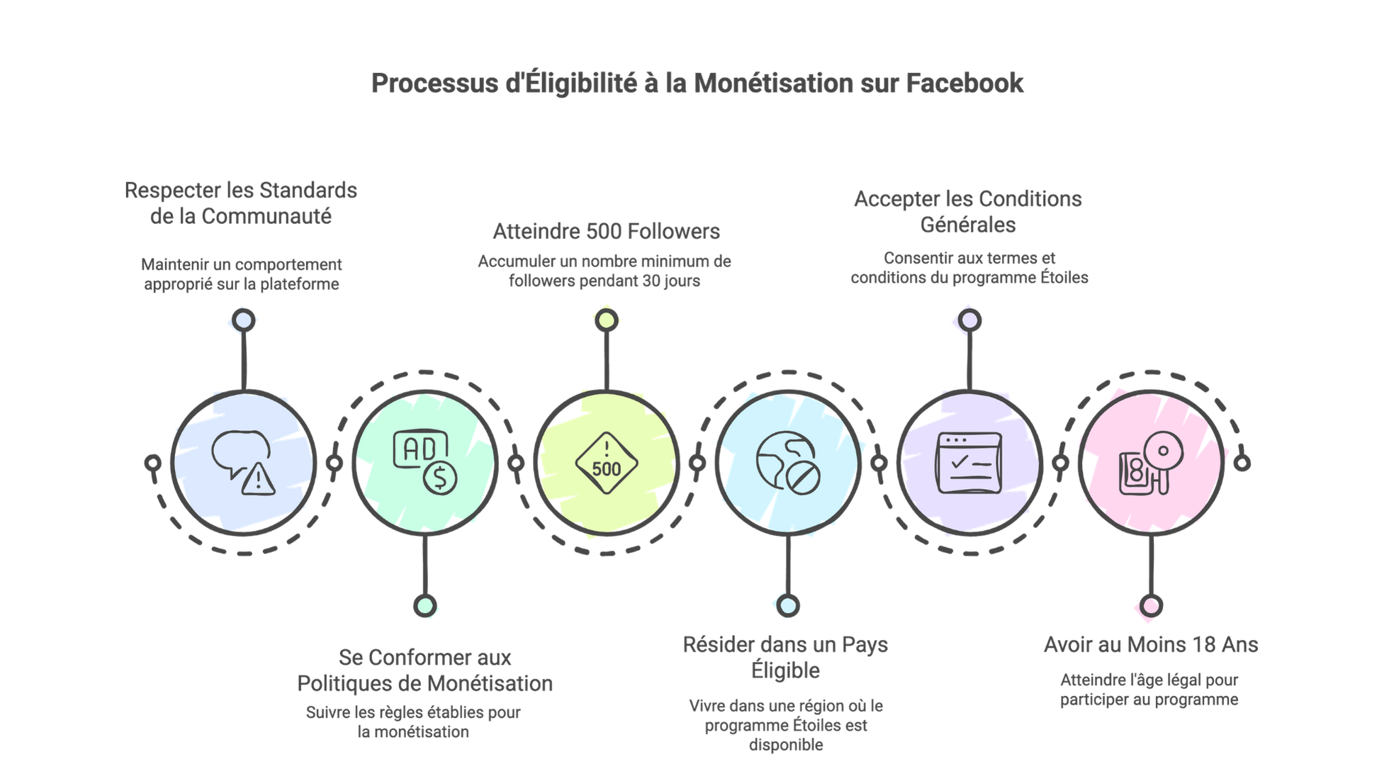 Vous devez avoir au moins 500 abonnés pendant 30 jours consécutifs, 18 ans minimum, respecter les Standards de la communauté et les Politiques de monétisation Meta, résider dans un pays éligible au programme Étoiles (la France en fait partie), et accepter les Conditions générales. Les comptes dédiés au contenu enfants sont exclus du programme.
